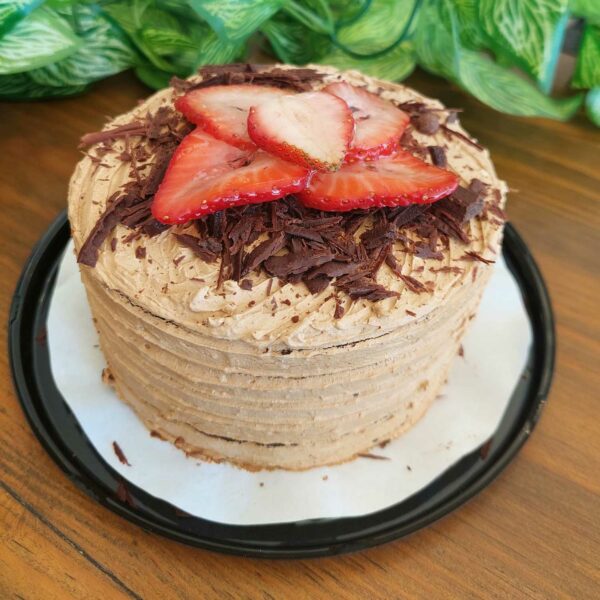 Delicioso pastel hecho a base de avena, claras de huevo, 100% cacao, proteína aislada de suero de leche, aceite de coco, leche descremada, endulzado con stevia y cubierto por una dulce capa de chantilly proteico de coco.